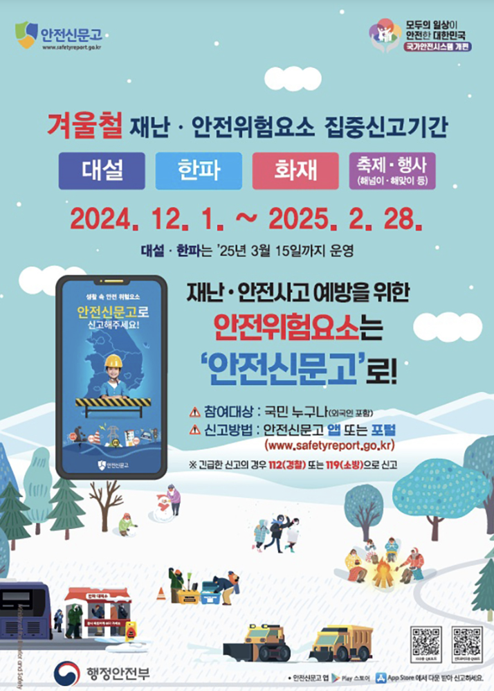 겨울철을 맞아 행정안전부가 재난 예방을 위한 대대적인 신고 캠페인에 돌입했다. 이번 캠페인은 대설, 한파, 화재, 축제·행사 안전을 중심으로 오는 12월 1일부터 내년 2월 28일까지 약 3개월간 운영된다.